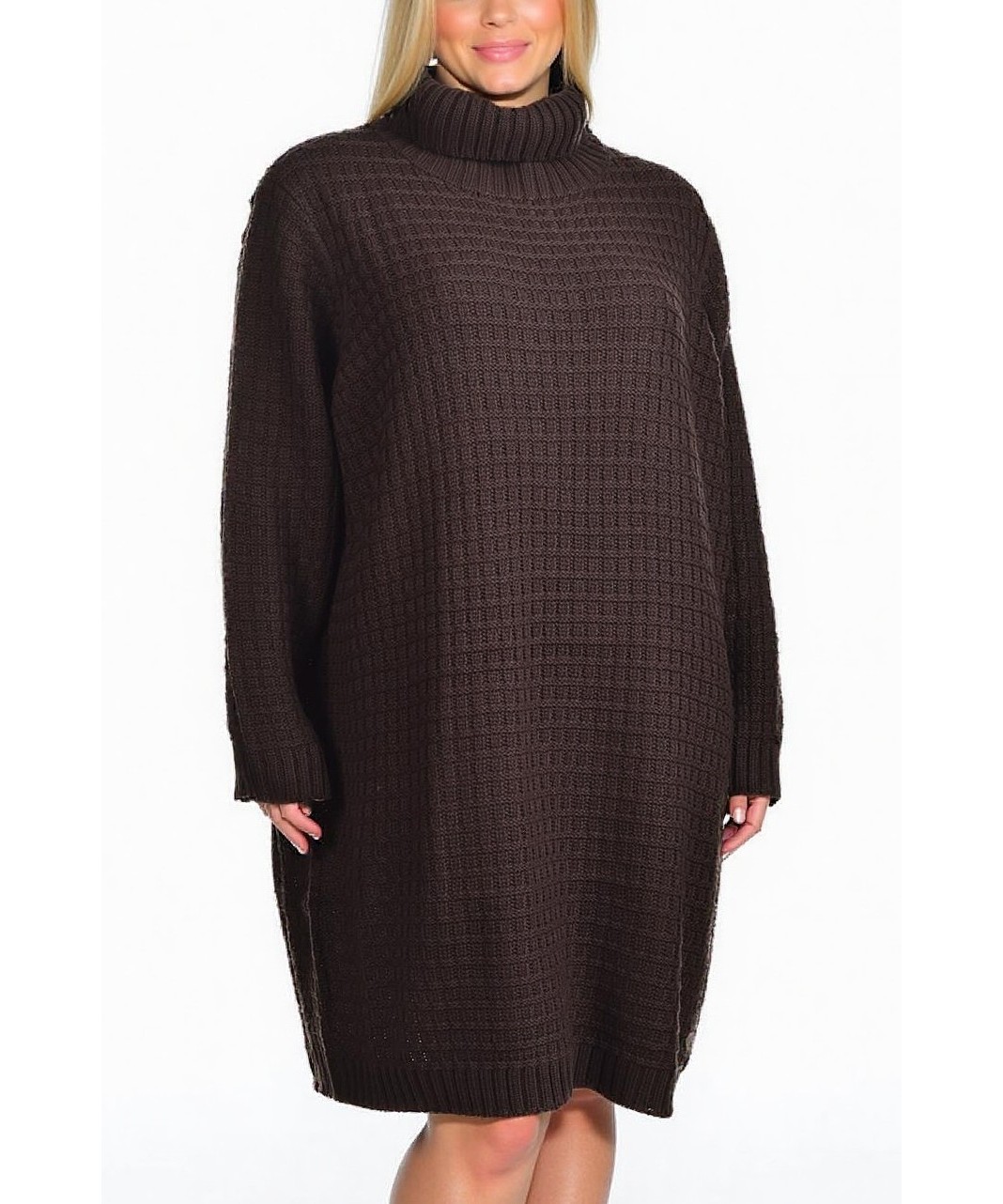 Удобна дамска плетена рокля тип пуловер с висока яка. Свободен силует, дълги ръкави и релефна шарка. Топла, стилна и подходяща за ежедневно носене и по-студено време. Мека материя, лесна за поддръжка.