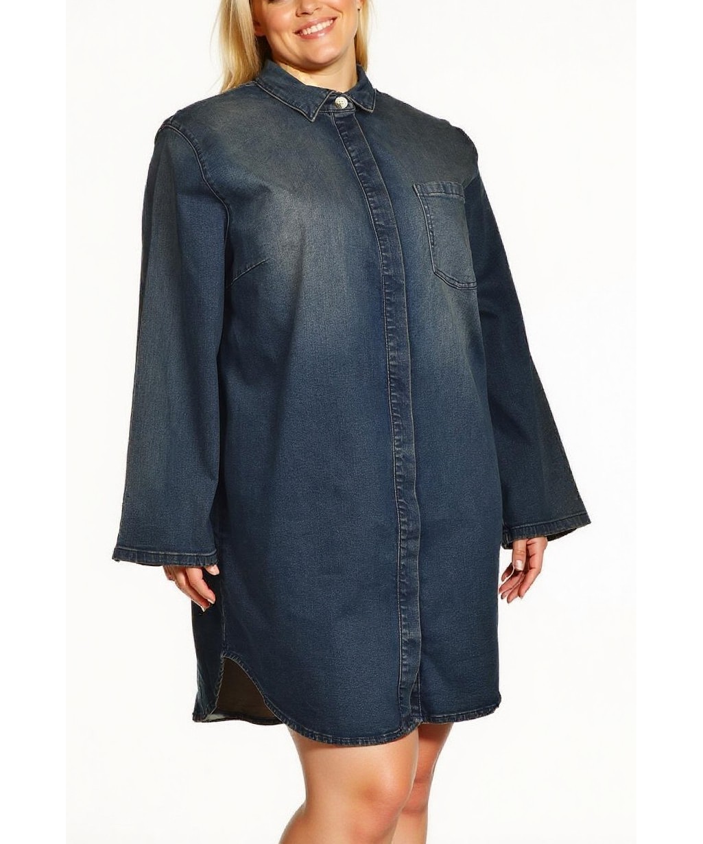 Памучна дънкова рокля-туника с копчета, свободна кройка, джоб на гърдите, широки ръкави и странични цепки. Ежедневна, удобна и стилна, в класически тъмен деним. Подходяща за сезон пролет-лято. лекота!