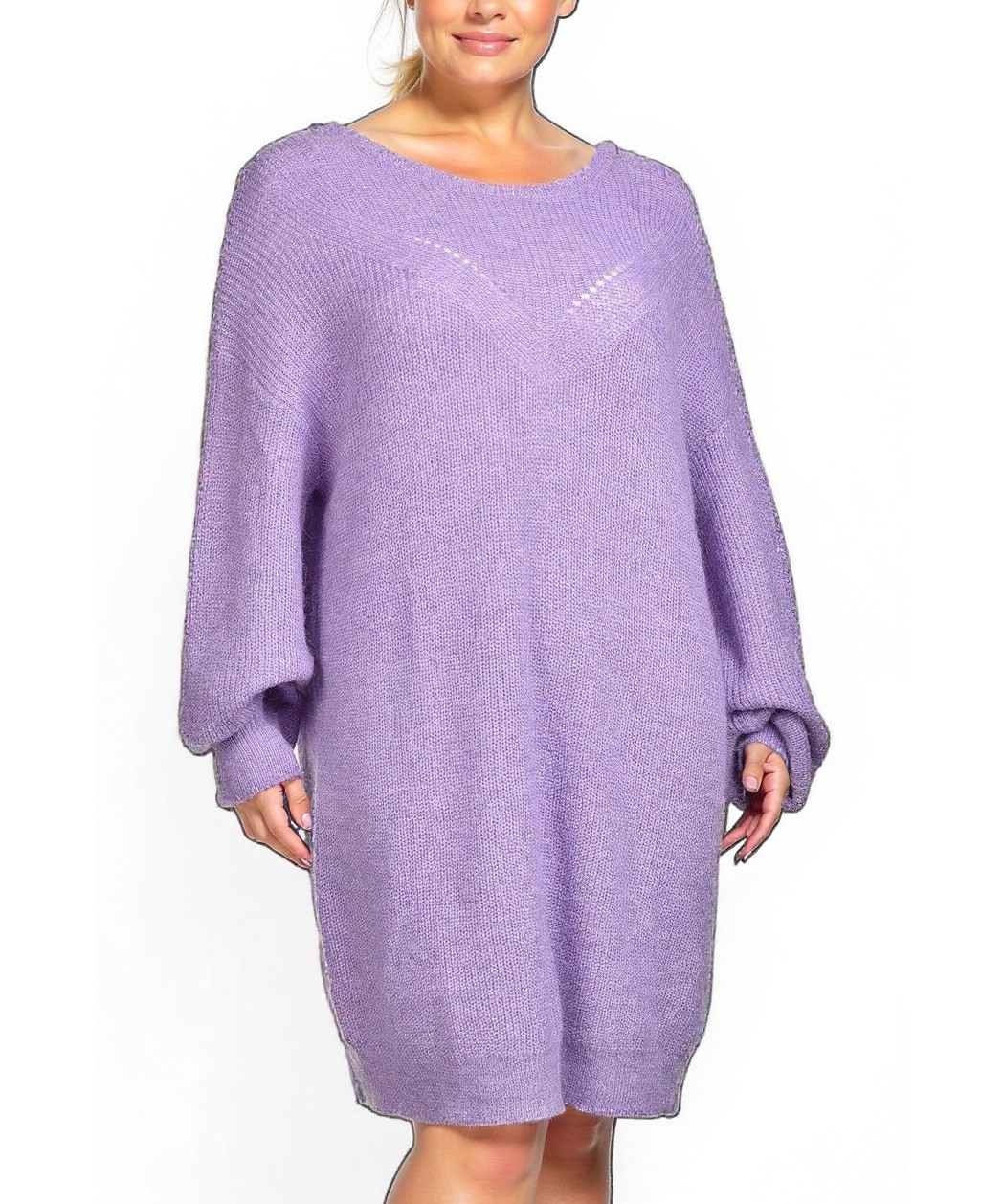 Мека плетена рокля в лавандулов нюанс с обемен свободен силует и спускащи се ръкави. Топла, удобна и елегантна за ежедневие или уютни излизания; комбинира се лесно с ботуши и аксесоари. идеален подарък
