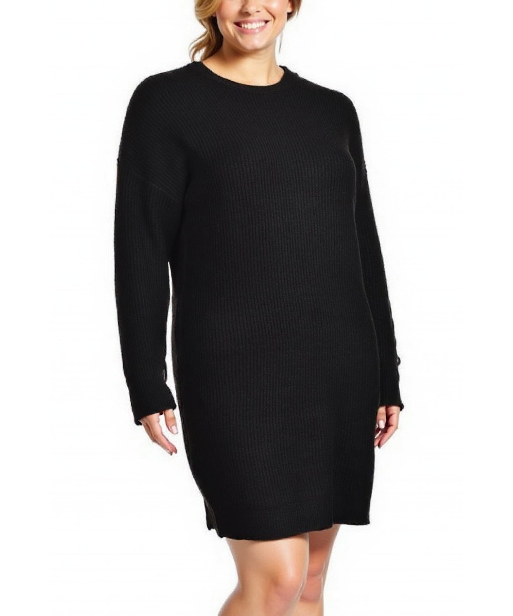 Елегантна черна плетена рокля тип суитшърт с дълги ръкави и кръгло деколте. Прав, леко втален силует до коляното. Мека, топла материя, идеална за ежедневие и по-студени дни. Удобна за всеки ден и нощ.
