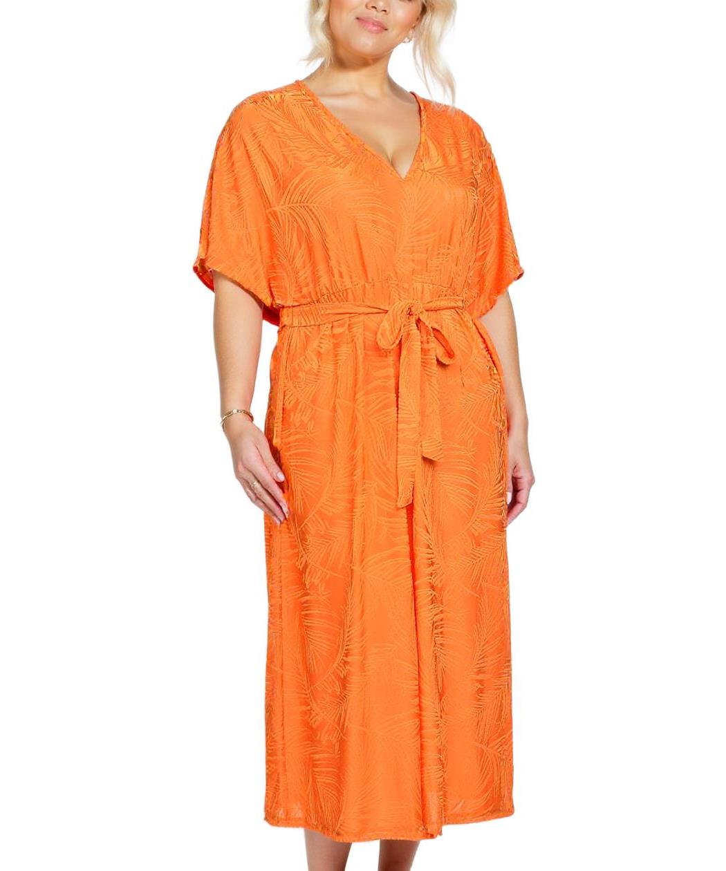 Оранжева рокля със свободна кройка и къс ръкав. Има V-образно деколте и текстурни шарки. В талията е подчертана с колан на възел. Материята е лека и подходяща за топло време. Идеална за ежедневни поводи.