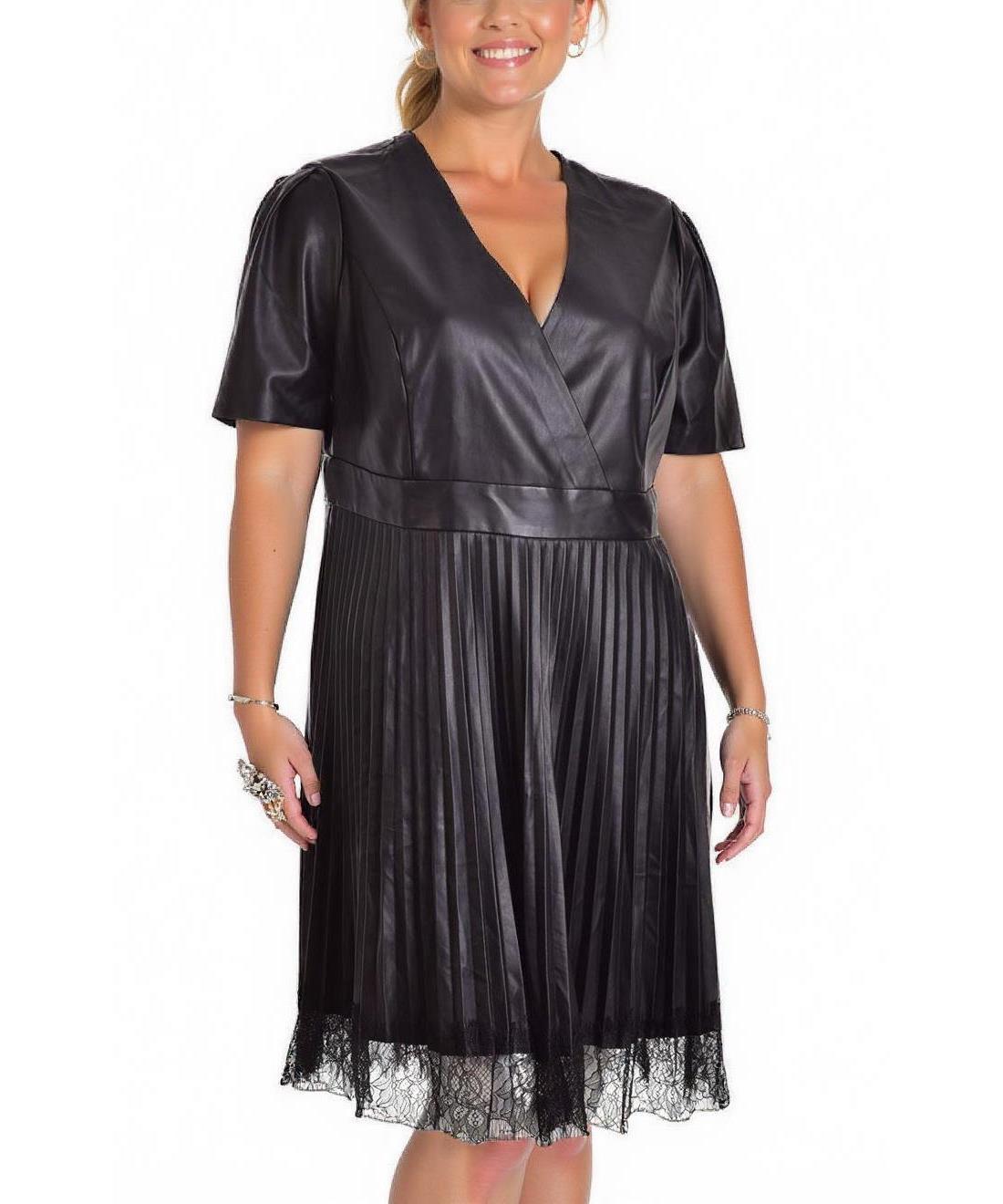 Елегантна рокля от еко кожа с V-образно деколте и къси ръкави. Плисирана пола с фин дантелен подгъв, характеризираща се с прилепнала талия и средна дължина. Идеална за вечерни излизания. Стилен и секси.