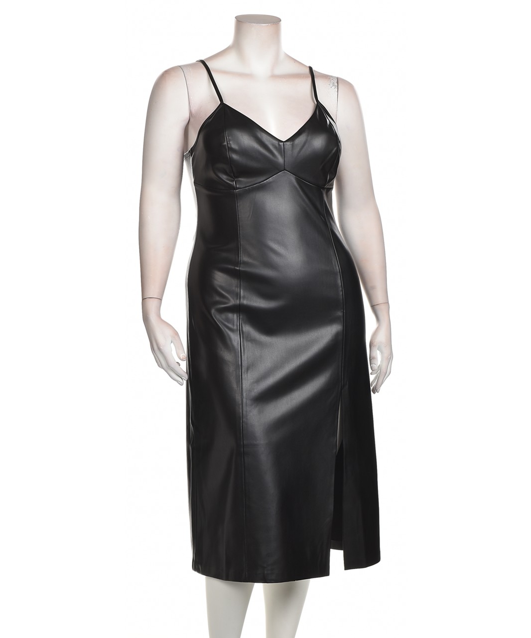 Елегантна рокля от еко кожа с тънки презрамки и оформена бюстие линия. Права кройка до прасците с дискретен шлиц отпред. Модерна, удобна и идеална за вечерни и ежедневни визии. Лесна за поддръжка. Еко!!