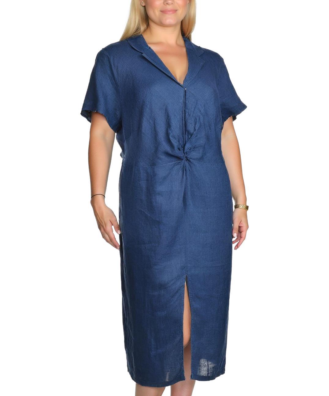 Тъмносиня ленена рокля със средна дължина и къси ръкави. Деколтето е с яка, а предната част има усукан детайл. Семпъл и елегантен дизайн, идеален за ежедневна или официална визия.