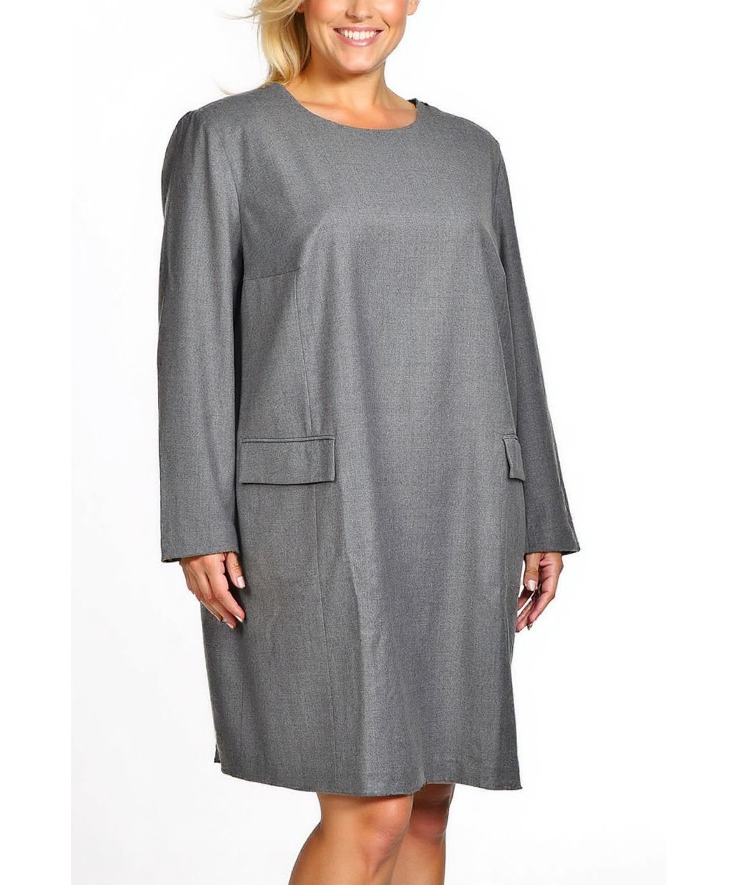 Елегантна рокля от вълнена смес, мека и топла, с изчистен силует, кръгло деколте и дълъг ръкав. Прав силует, кръпчета с капаци отпред, подходяща за офис и ежедневие през студените сезони. универсална.