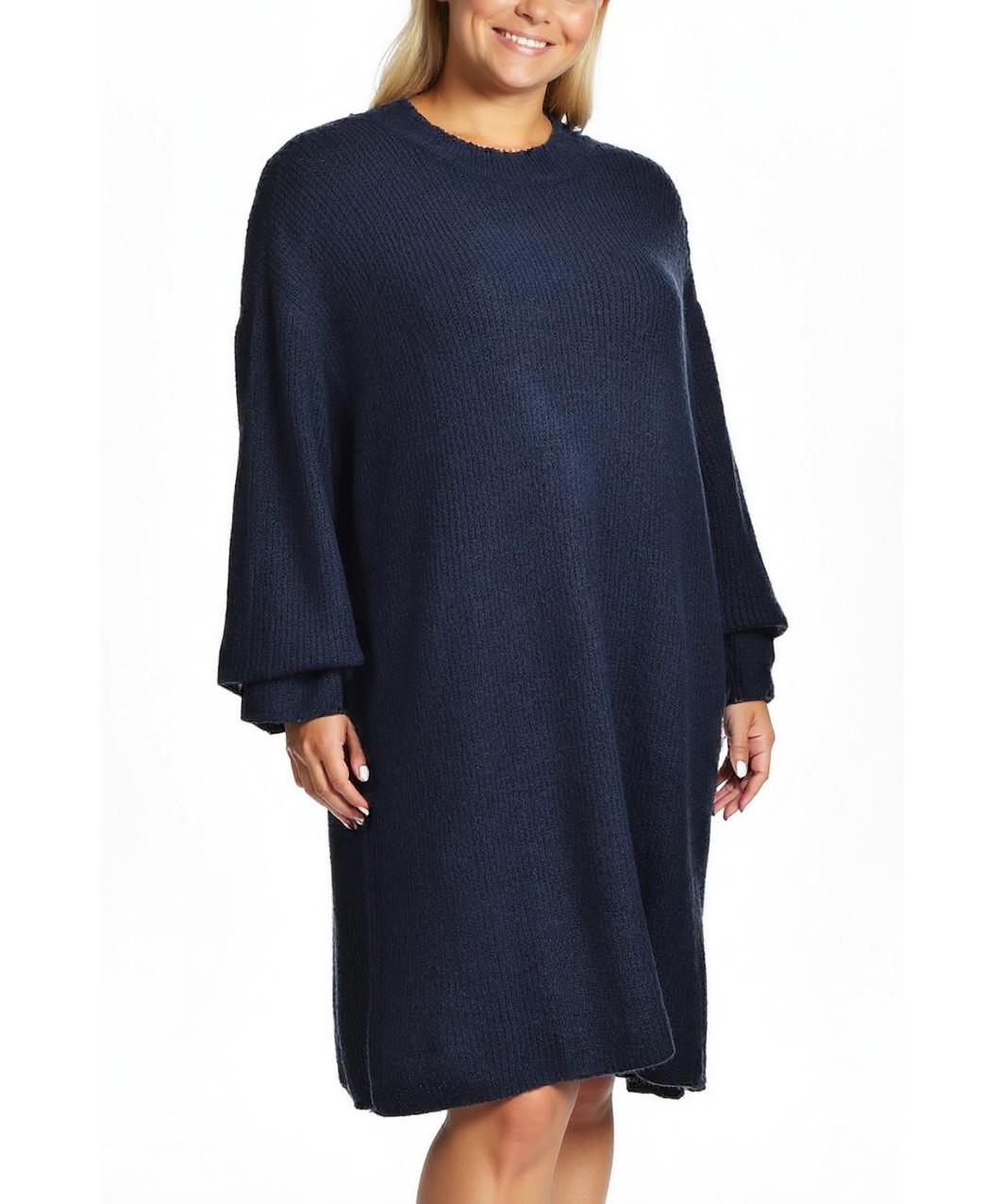 Елегантна тъмносиня плетена рокля с midi дължина, свободна кройка и обемни ръкави. Мека материя, кръгло деколте и изчистен дизайн за ежедневен комфорт и стил. Перфектна за хладни дни. Идеална за офис.
