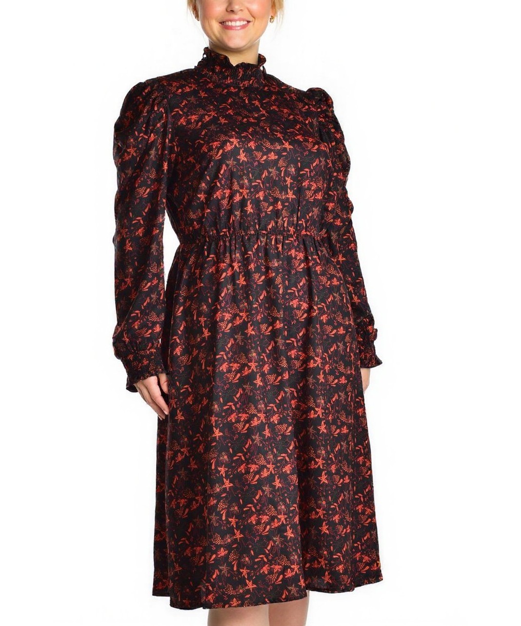 Рокля миди в ретро стил, черна с червен флорален принт. Висока яка с нежни къдри, паднали ръкави с маншети, вталена силуетна талия и широка, плавна пола. Много стилна и удобна Подходяща за всеки ден