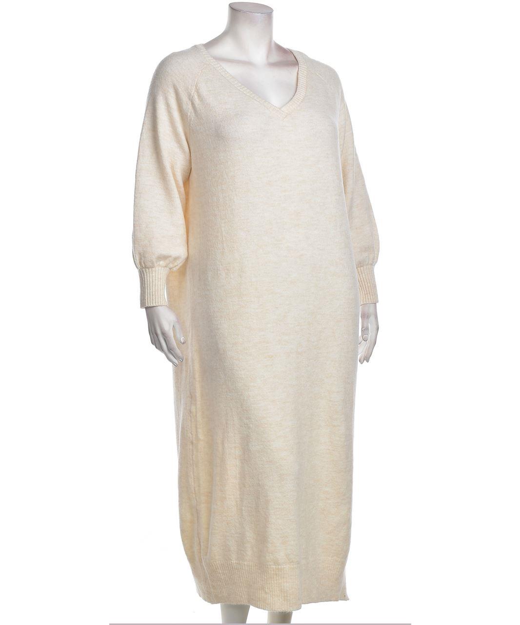 Елегантна плетена рокля в кремав нюанс с V-образно деколте, дълги балон ръкави и ластични маншети. Свободен, удължен силует за комфорт и топлина през есен-зима. Мека, стилна и универсална Лесна грижа