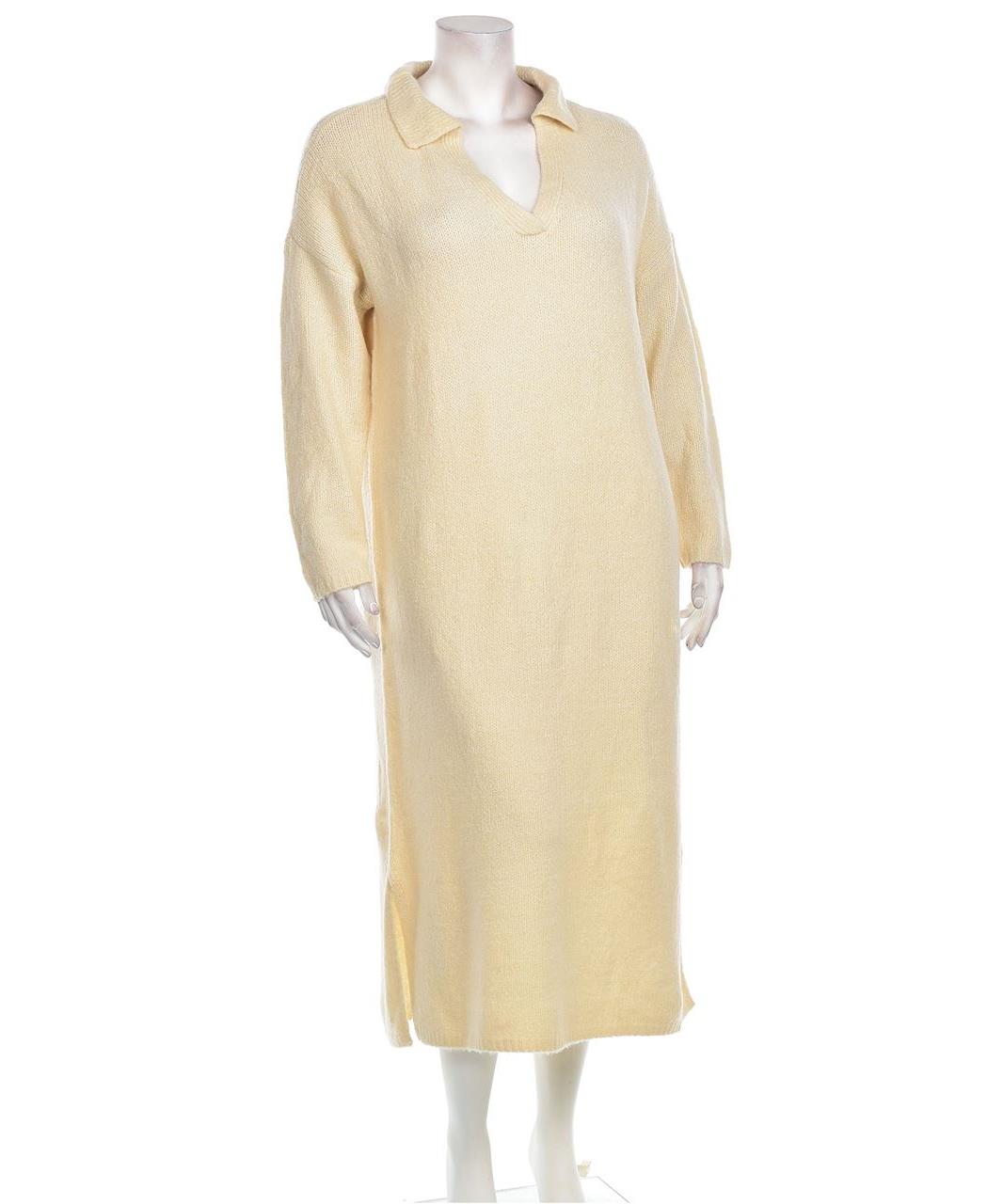 Кремава макси рокля от мека плетена материя. Свободна кройка с поло-яка и V деколте, дълъг ръкав и странични цепки. Стилна, удобна и лесна за поддръжка. Подходяща за пролет и есен; комбинира се лесно.
