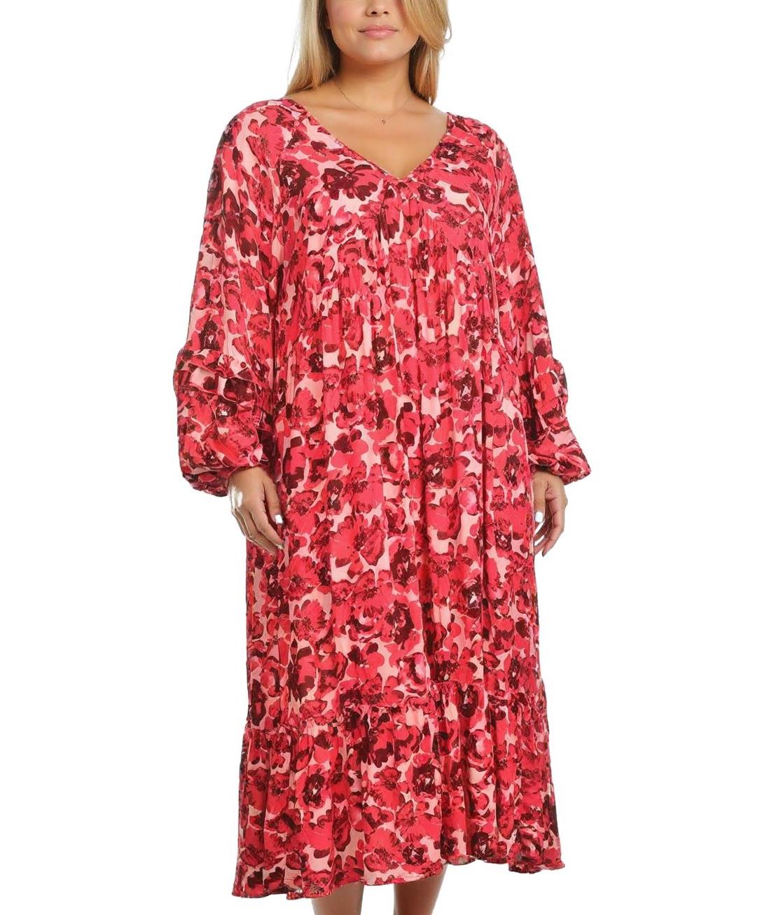 Ефирна рокля от вискоза с цветен червено-розов флорален принт, V-образно деколте, обемни ръкави и свободна кройка. Удобна, лека и стилна за ежедневие или празнични поводи. Подходяща за плаж, град офис.