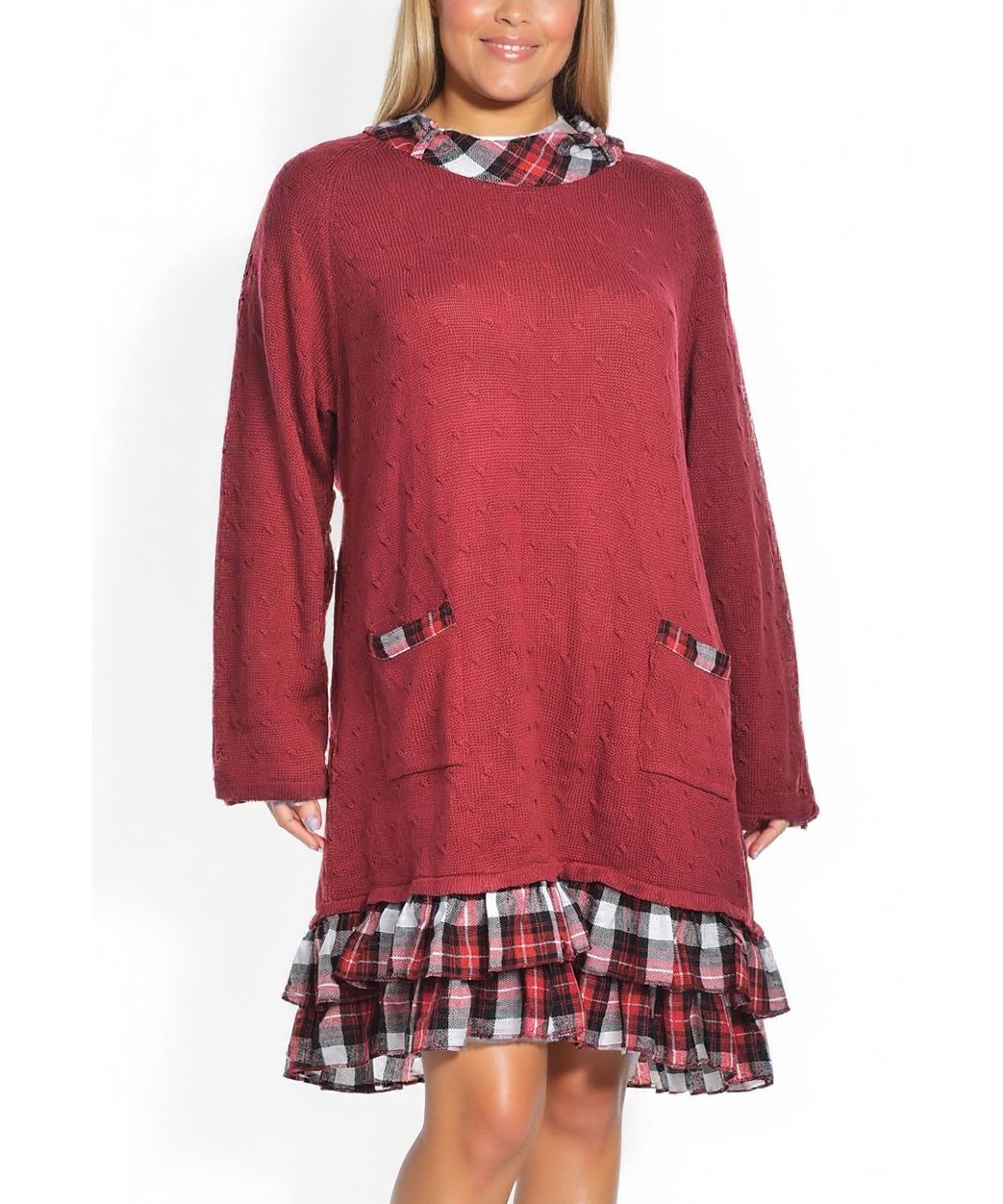 Дамска рокля в тъмночервен цвят с дълъг ръкав и свободен силует. Декоративни карета на полата и джобчетата придават игрив чар. Мека материя, подходяща за ежедневие и преходни сезони. Удобна и стилна