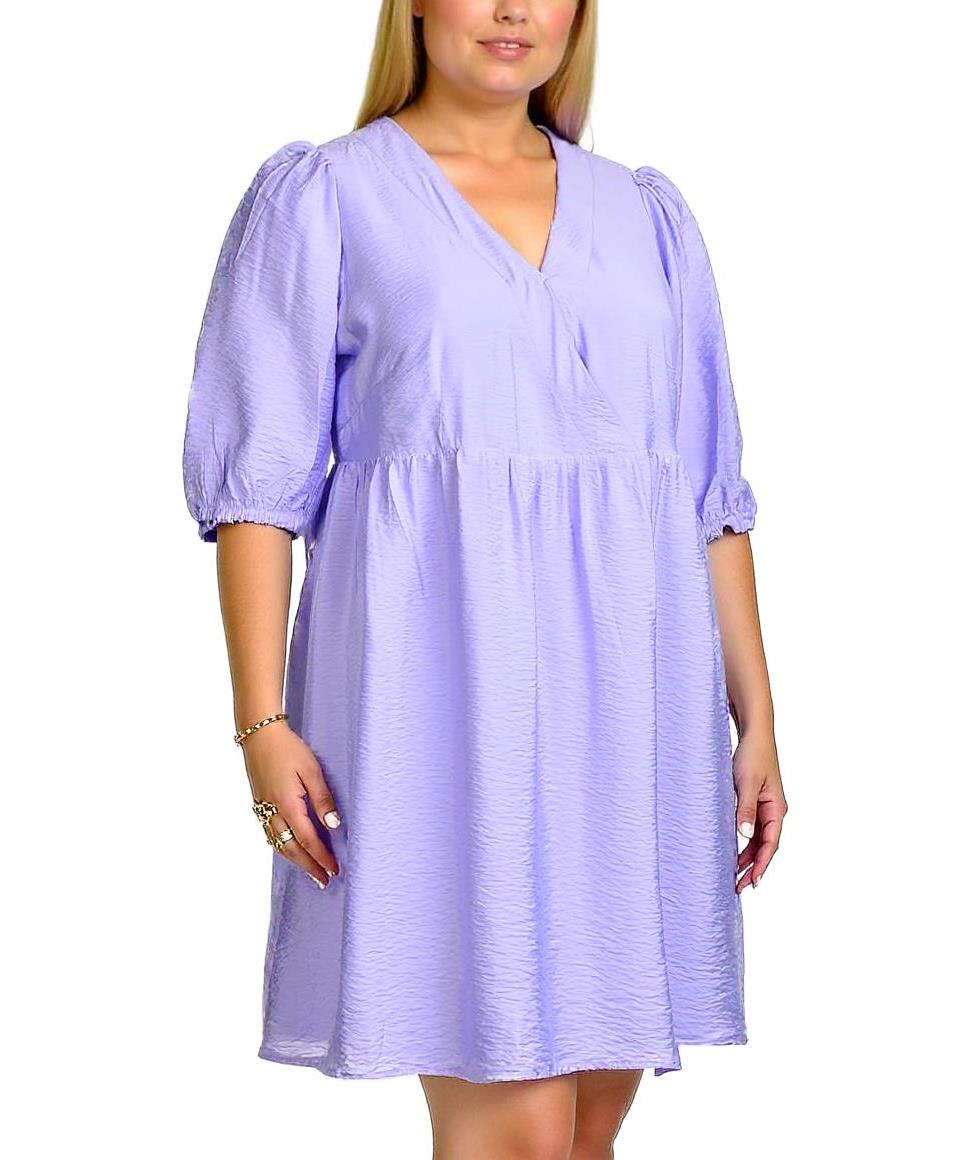 Лилава рокля от вискоза с къс буфан ръкав и V-образно деколте. Дължината е до коляното, придавайки елегантност и комфорт. Подходяща за различни поводи. Лека и приятна на допир материя.