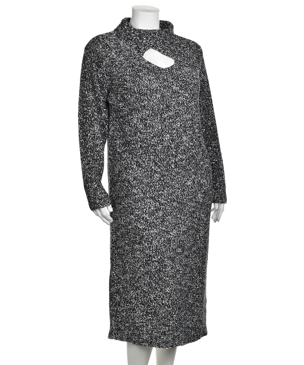 Миди рокля от вълна в меланж черно и бяло. Прав силует с дълъг ръкав, висока яка и асиметричен прорез на деколтето. Топла, приятна на допир, елегантна и подходяща за офис и ежедневие. Удобна и стилна