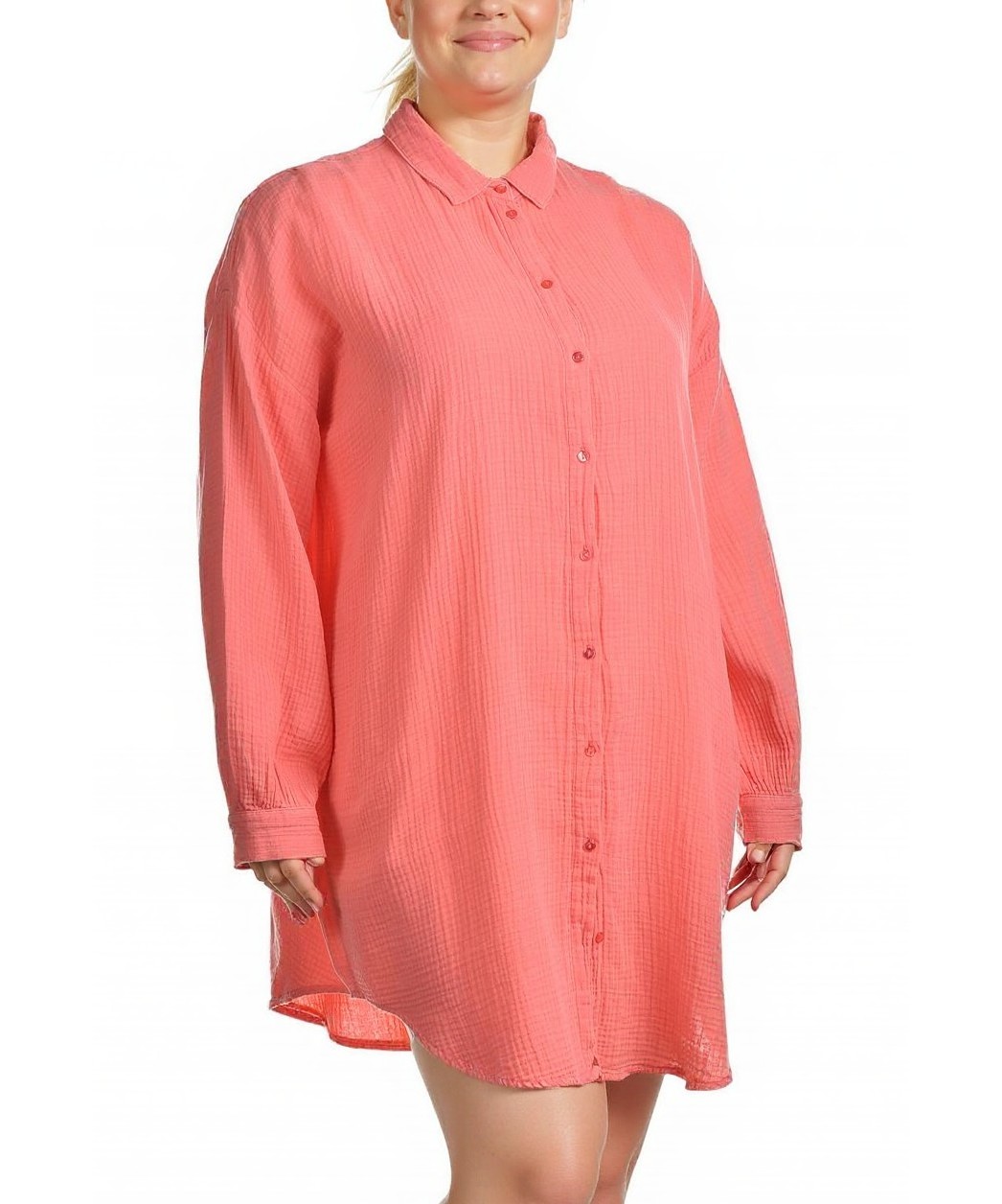 Лека памучна туника-рокля в коралов цвят. Свободен силует, копчета отпред, класическа яка и дълги ръкави. Дишаща, удобна и подходяща за ежедневие и ваканция. Лесна за поддръжка, перфектна за плаж.