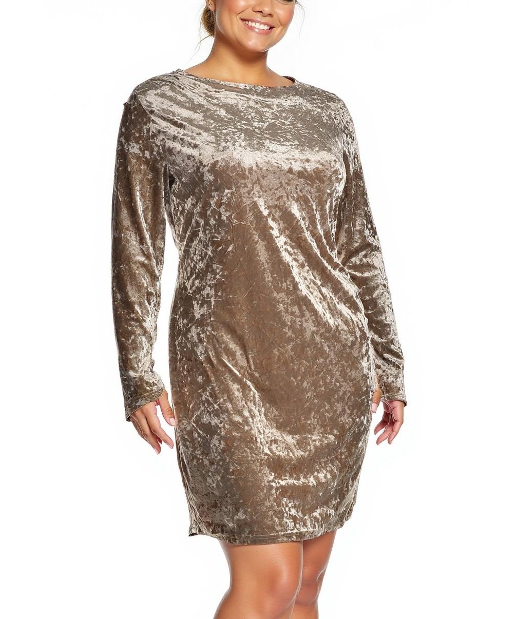 Елегантна къса рокля от плюш с блясък, права кройка и дълъг ръкав. Мека и удобна, подходяща за вечер и празник. Нежен бежов оттенък, луксозен вид и изискана текстура. Перфектна за сезона; лесна грижа.