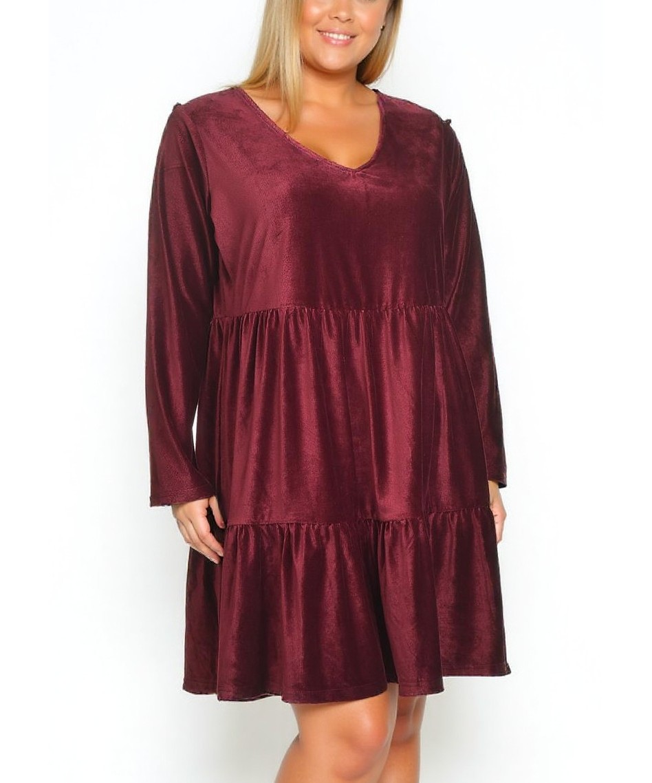 Бордо велурена рокля с V-образно деколте и дълги ръкави. Свободна, многоредна пола с набори за ефирен силует. Комфортна и елегантна за ежедневие и по-специални поводи. Подходяща за всеки сезон и стил.
