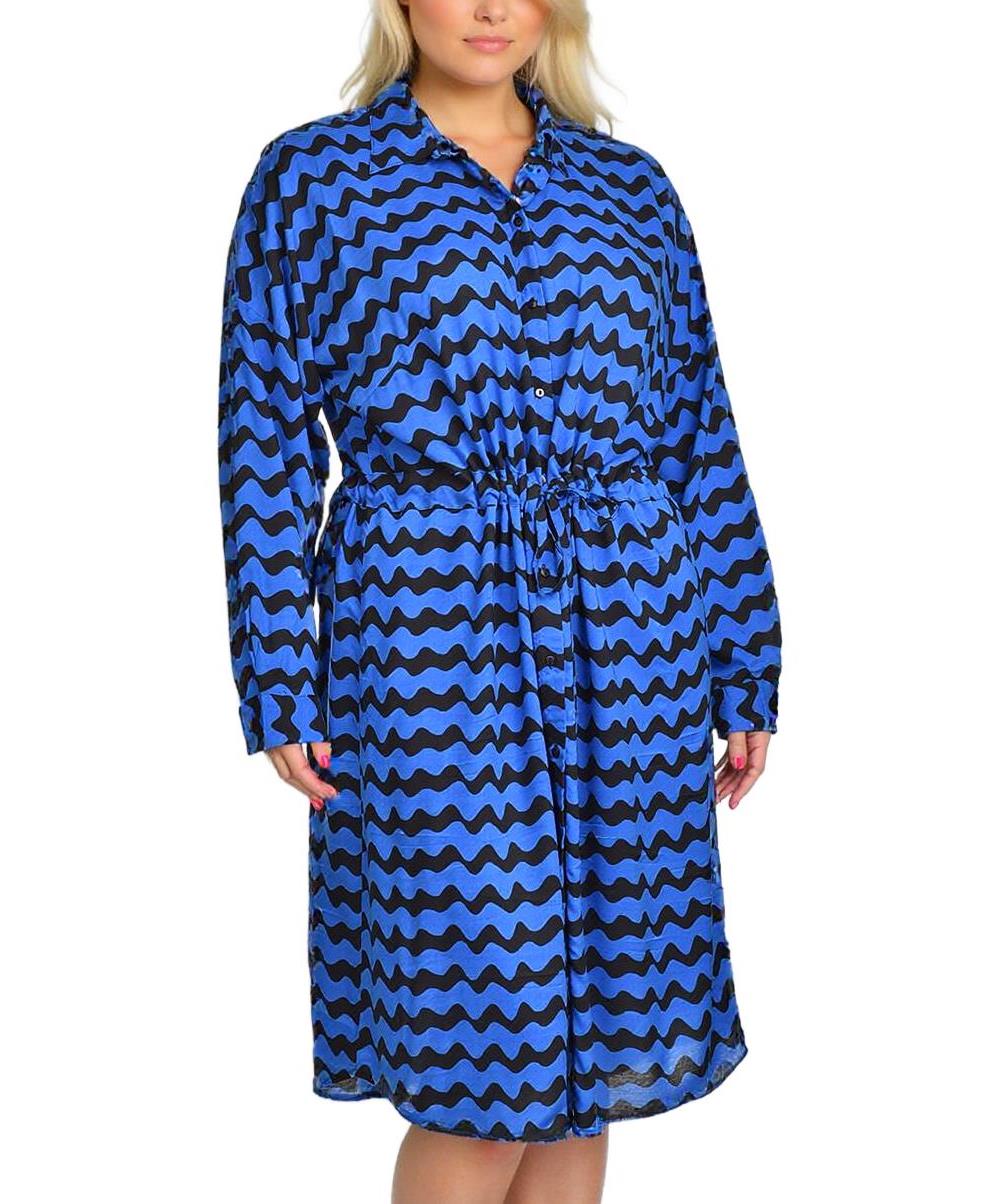 Елегантна рокля от вискоза в наситено синьо с черни вълнообразни райета. Риза стил с яка и копчета, дълги ръкави и регулируема талия с връзка. Комфортна, лека и подходяща за ежедневие и офис. Вталява.