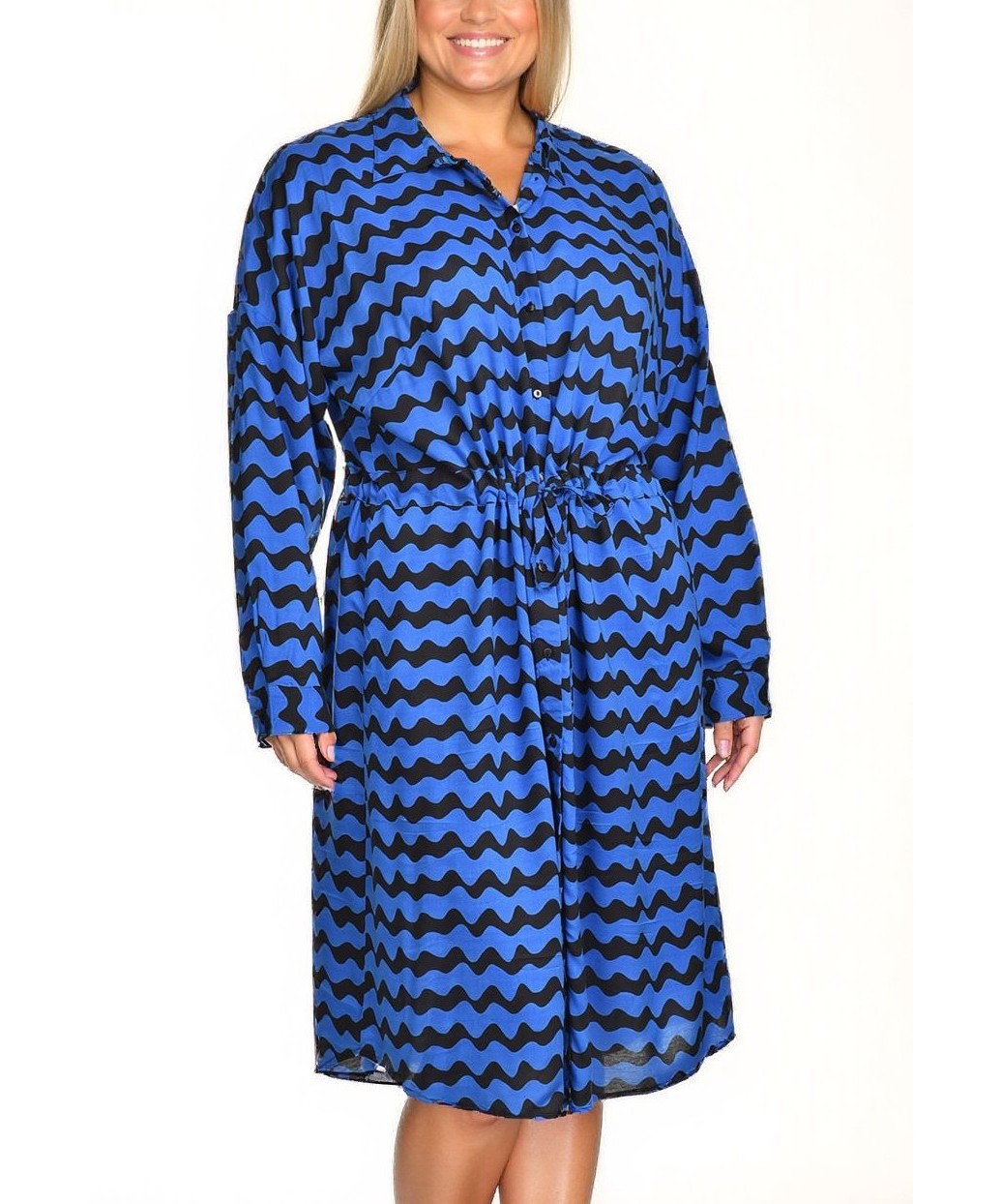 Елегантна рокля от вискоза в наситено синьо с черни вълнообразни райета. Риза кройка с копчета, дълги ръкави и регулиращ се колан на талията. Комфортна, подходяща за всеки ден и офис. Стилен избор.!!!