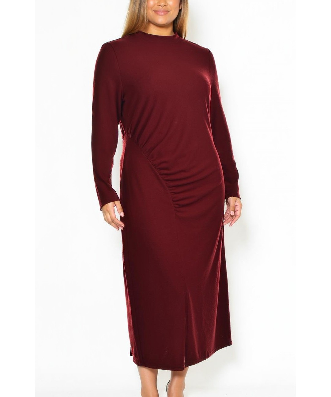 Елегантна миди рокля от мека вискоза в бордо. Дълъг ръкав и висока яка. Асиметрични драперии оформят талията, предна цепка за комфорт. Подходяща за офиса и вечерни излизания. Шик. Удобна, мека материя