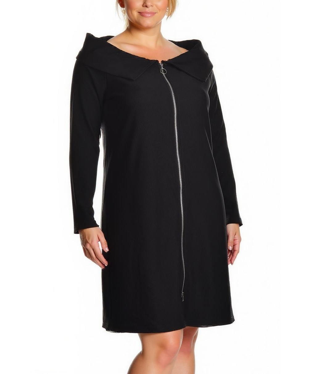 Черна елегантна рокля с дълъг ръкав и ефектна яка с извивка, централен метален цип до подгъва. Прав силует до коляното, комфортна, стилна за работа и вечерни събития. Съчетава се лесно. С цип отпред.