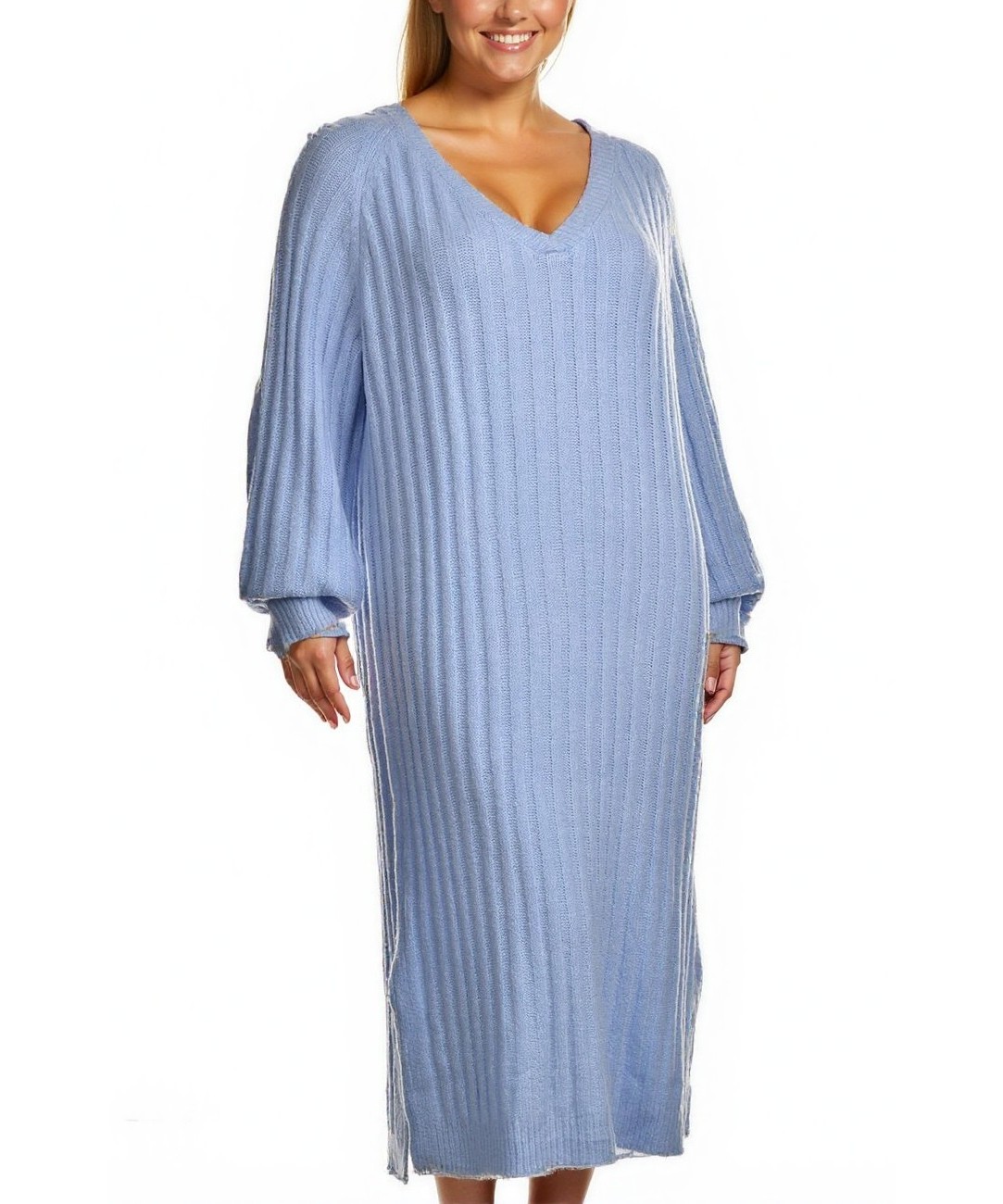 Елегантна дълга рокля от мека плетена материя в светлосиньо. Свободен силует с V-образно деколте, балонени ръкави и дискретни странични цепки. Идеална за ежедневие и уют. Подходяща за работа и вечери.