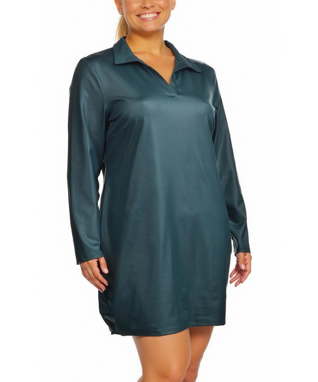 Елегантна сатенена рокля в дълбоко зелен нюанс, с яка и дълги ръкави. Прав силует до коляното, лек блясък, удобна и универсална – подходяща както за ежедневие, така и за изискани поводи. Лека и стилна.