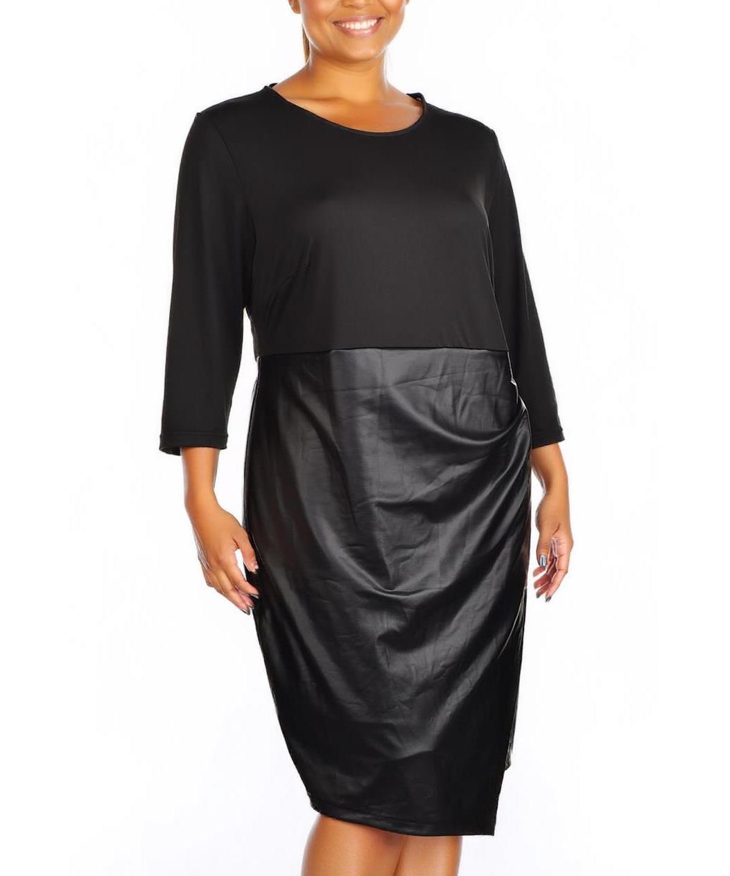 Елегантна черна рокля с комбинация от мека материя в горната част и пола от еко кожа. 3/4 ръкав, права линия с нежно набиране в кръста. Стилна и удобна за официални и ежедневни поводи. За всеки повод.