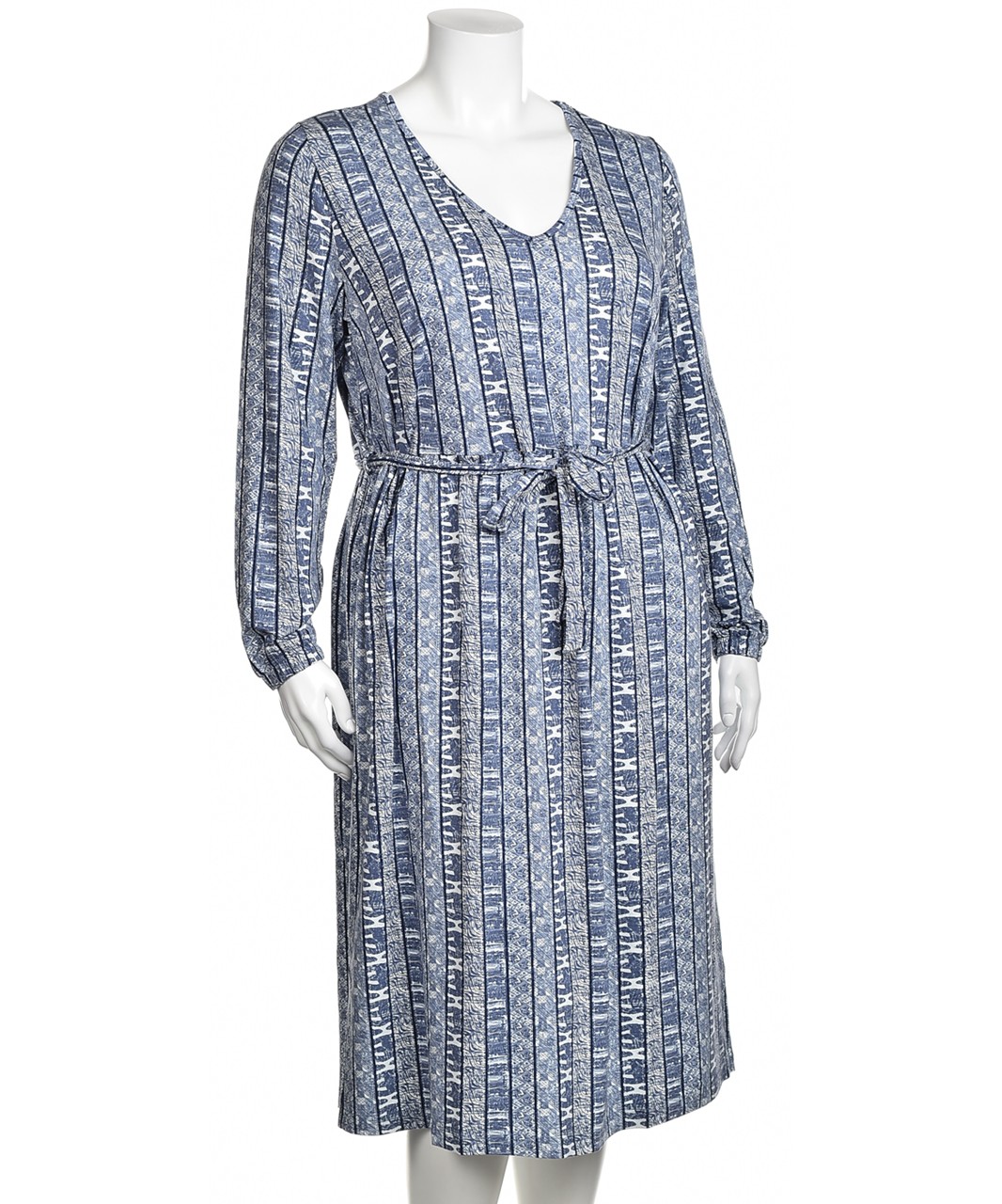 Рокля с вертикални шарки, изработена от вискоза. Разполага с V-образно деколте и колан за подчертаване на талията. Дългите ръкави завършват с ластици за удобство. Подходяща за ежедневни и официални поводи.
