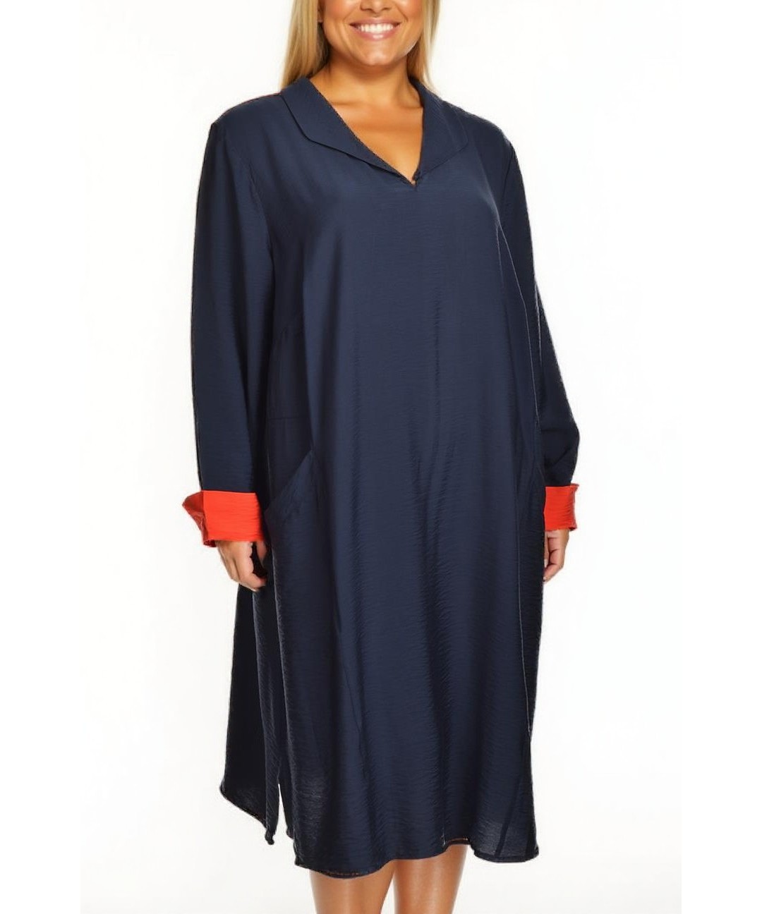 Миди рокля от вискоза в тъмносин цвят. Свободна кройка с V-образно деколте и яка. Дълъг ръкав с контрастни оранжеви маншети. Странични джобове, лека и дишаща материя – идеална за ежедневие.
