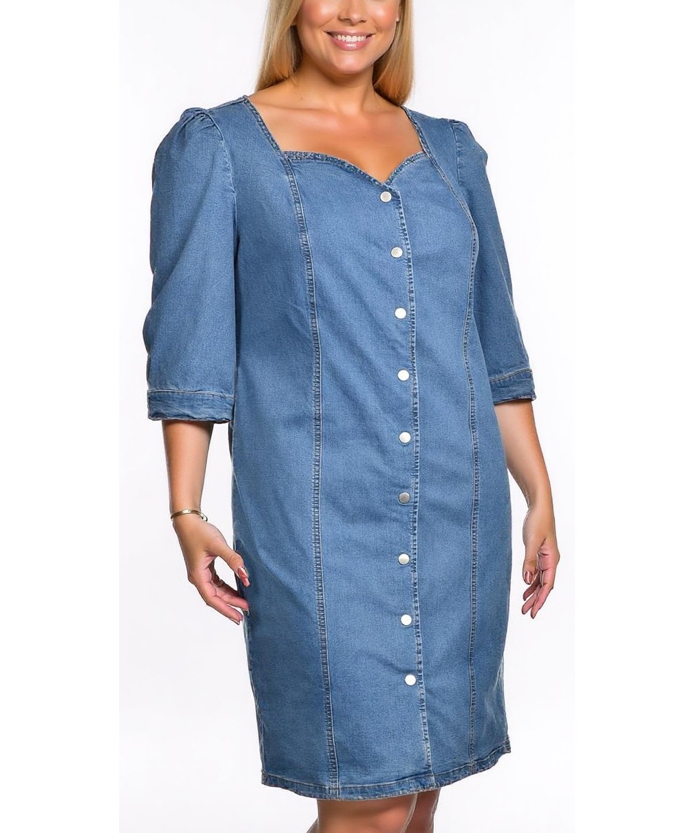 Роклята е изработена от висококачествен памук деним в син цвят, с прав силует и средна дължина. Дизайнът включва предно закопчаване с копчета и 3/4 ръкави, придаващи удобство и стил. Подходяща за ежедневието и специални случаи.