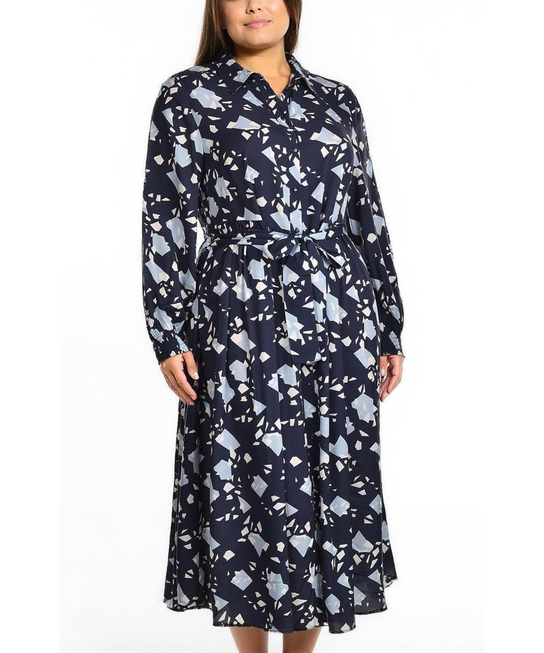 Елегантна рокля от ВИСКОЗА с ризова яка, дълъг ръкав и копчета отпред. Миди дължина, свободна линия и колан, който подчертава талията. Тъмносиня основа с абстрактен принт, мека и ефирна Лека и удобна