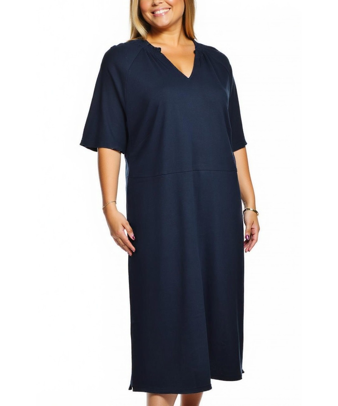 Тъмносиня миди рокля от 100% памук, с V-образно деколте и леко къдрене. Свободен силует, къси ръкави и странични цепки. Дишаща, удобна и подходяща за всеки ден. Подходяща за пътуване и ежедневие лека.