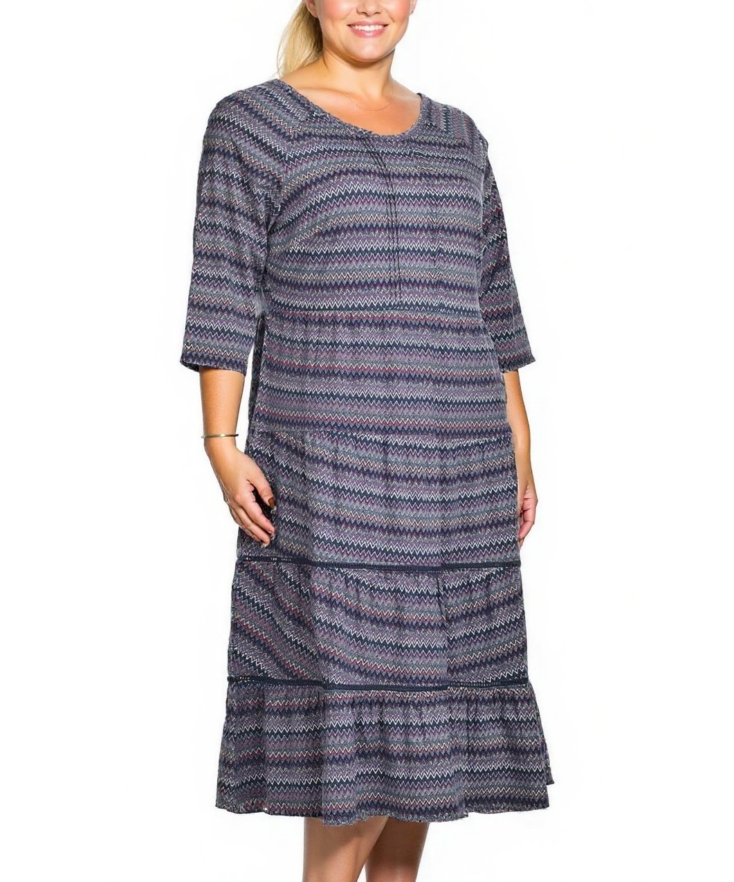 Памучна макси рокля с три-четвърт ръкави и разкроена воланна пола. Свободна кройка, фин зигзагообразен десен в тъмни тонове. Удобна, дишаща и лесна за поддръжка — идеална за ежедневно носене. Подходяща за