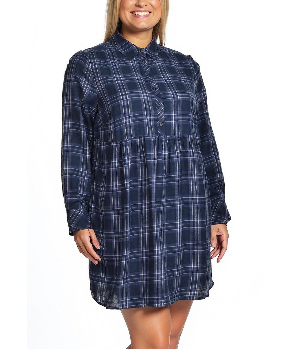 Рокля от 100% памук в тъмносиня каре. Свободна, права кройка с набор в талията, яка и копчета отпред. Дълги ръкави, мека и дишаща материя, идеална за ежедневие и пътувания. Лесно се пере запазва формата