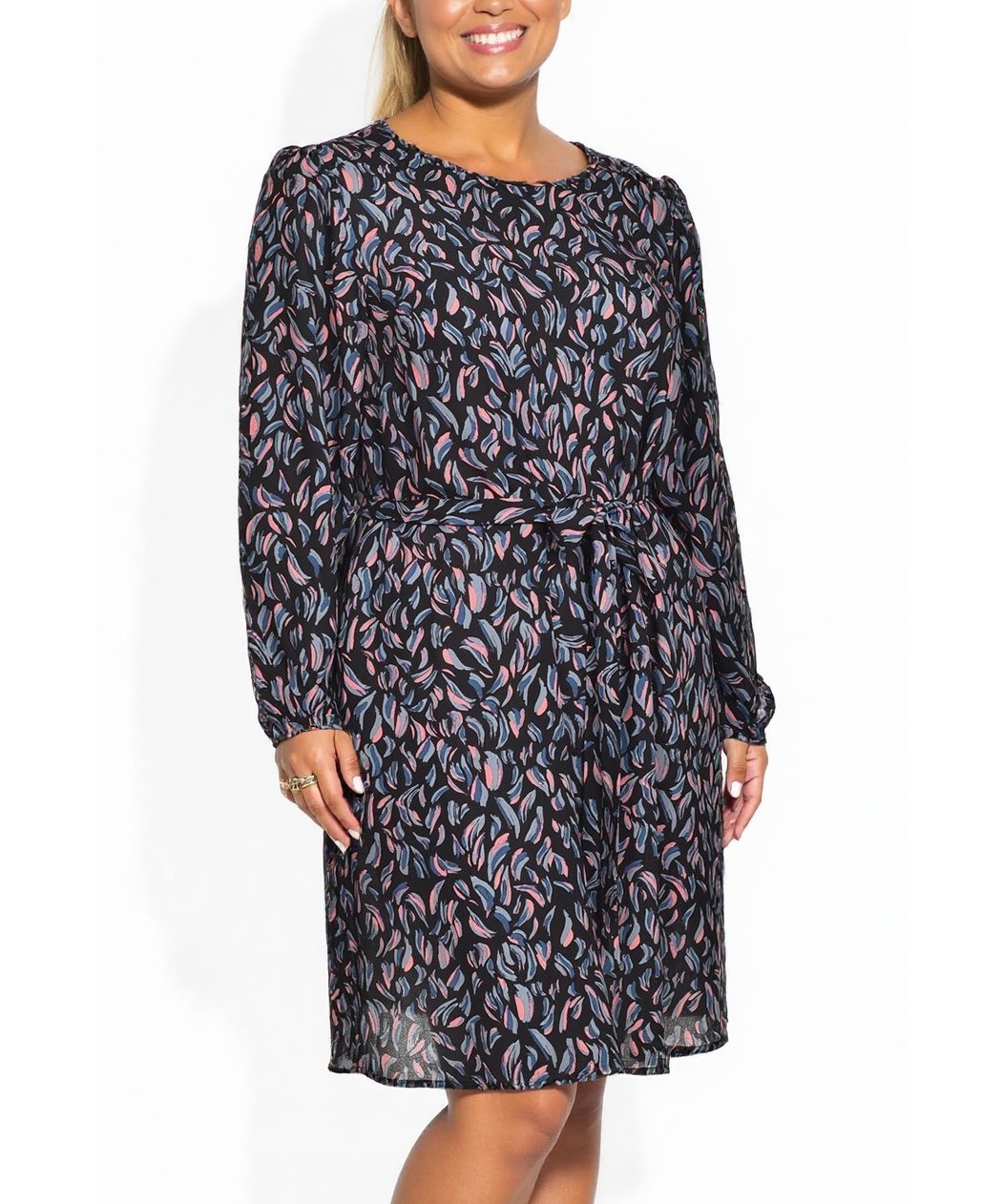 Рокля от ВИСКОЗА. Мека и лека, с дискретен листен принт, дълги ръкави и връзка на талията за оформяне. Свободна, до коляното, универсална за офис и градски визии. Лесна за поддържане. Удобна за всеки.