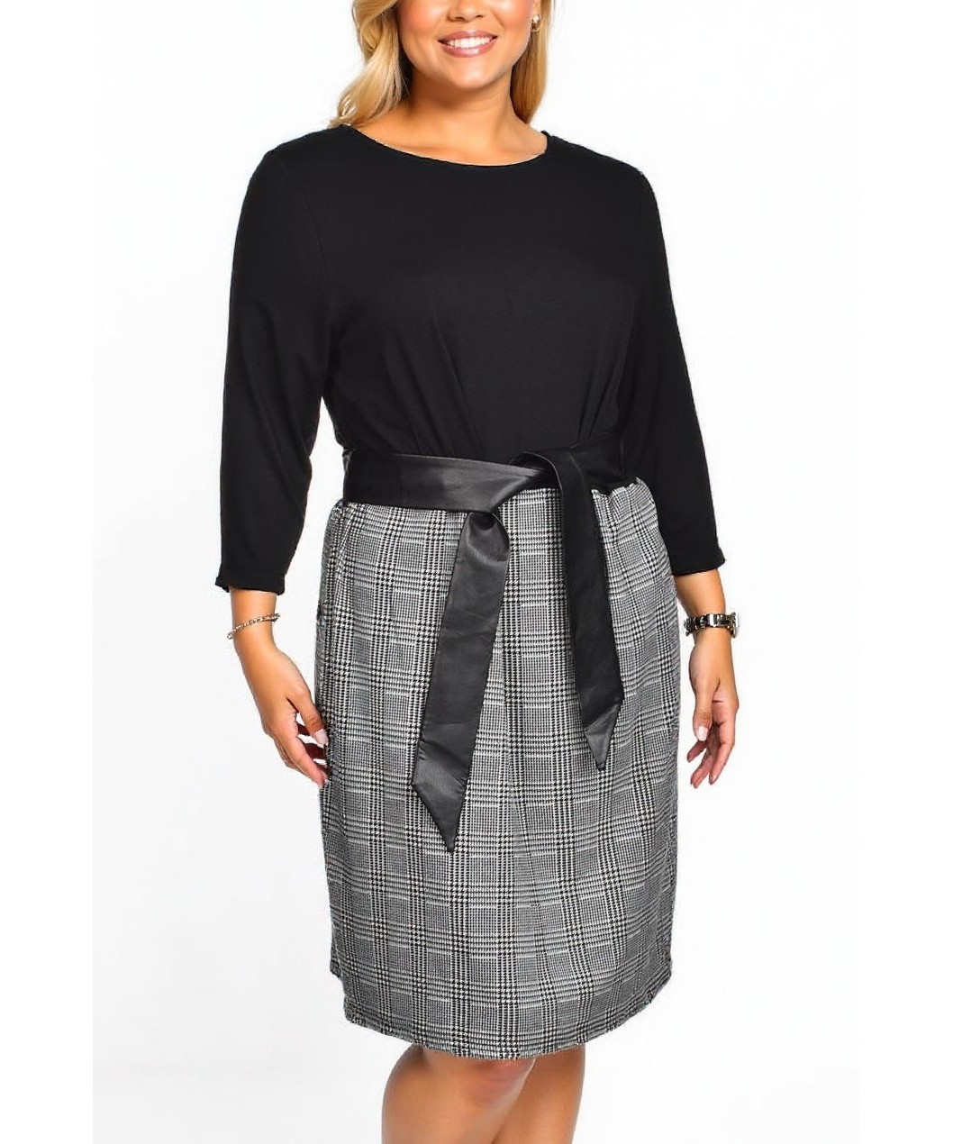 Рокля за бременни от вискоза, съчетаваща комфорт и стил. Горната част е черна с дълги ръкави, а полата е с елегантен каре десен. Завършва с черен колан, подчертаващ талията. Идеална за всеки повод.
