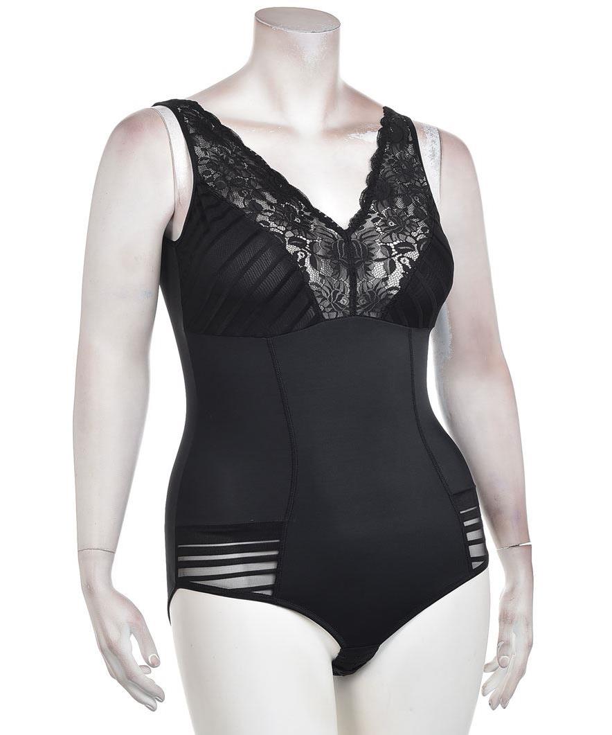 Черно стягащо боди с дантелени чашки и широки презрамки. Оформя талия и корем, изглажда силуета, диша благодарение на мрежестите панели. Удобно за всекидневна и официална употреба.