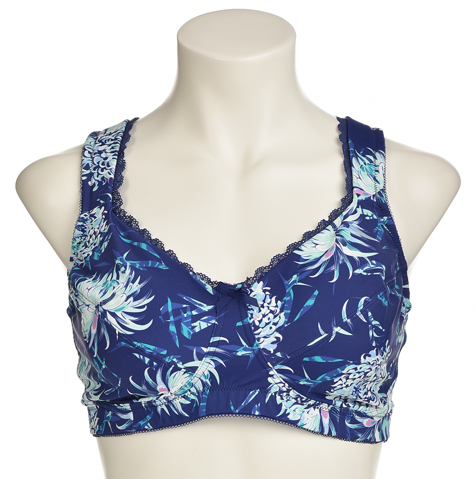 Комплект от 2 меки безжични сутиена с еластична поддръжка и широки регулируеми презрамки. Висок комфорт за ежедневна употреба, леко подплатени чашки и стилен флорален десен в тъмносиньо, без банели.