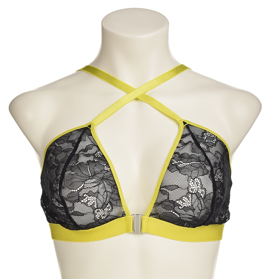 Елегантен дантелен сутиен в черно с жълто-зелени акценти. Прозрачен, мека чашка без подплънки, с кръстосани презрамки и фронтално закопчаване. Подчертава деколтето и осигурява лек комфорт. И е стилен