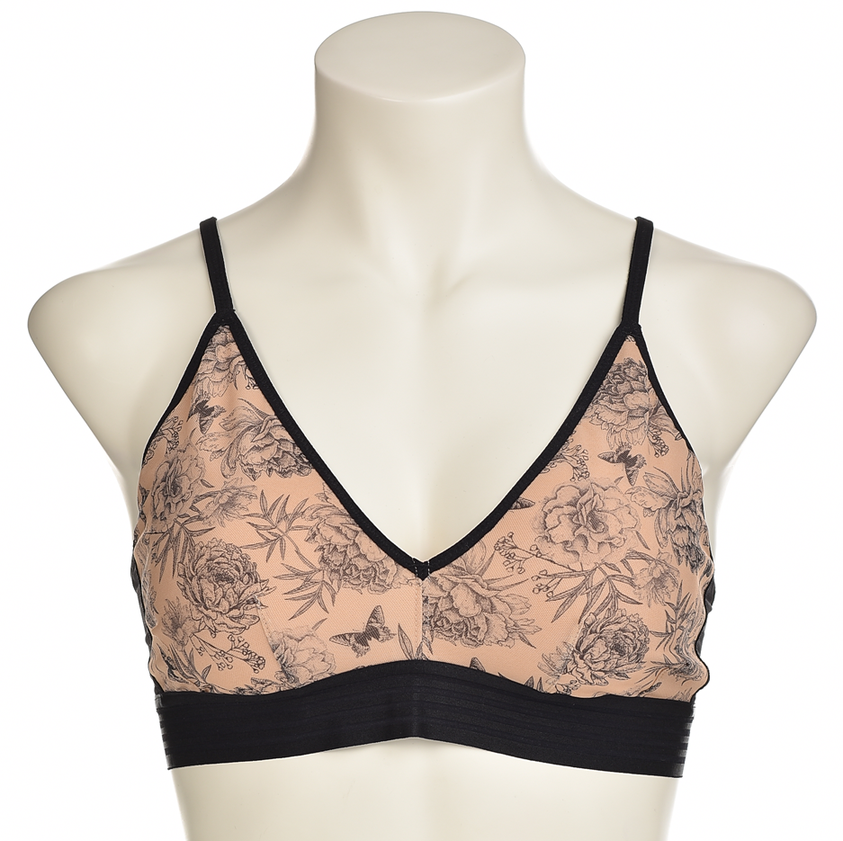 Нежен сутиен без банели с флорален принт в прасковено и черно. Тънки регулиращи се презрамки, меки чашки и широка еластична подгръдна лента за ежедневен комфорт и дишаща материя. Много удобен, стилен.