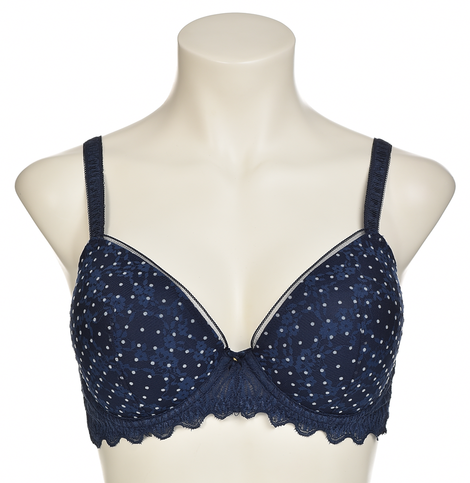 Елегантен тъмносин сутиен с подплатени чашки и леко извиване за оформяне. Декориран на точки с фина дантела по долния ръб, удобни регулируеми презрамки и сигурно закопчаване на гърба. Удобен всеки ден.