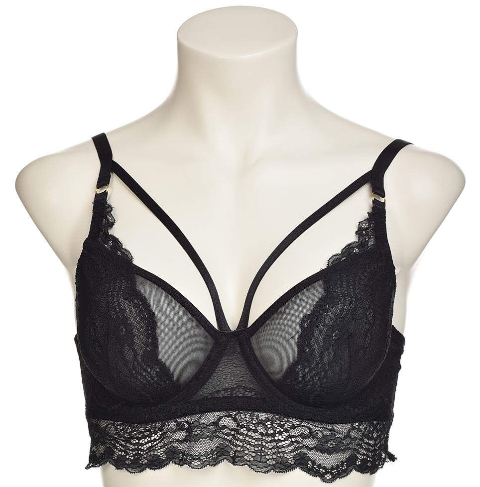 Елегантен черен дантелен сутиен с подплънени чашки и банели, фини регулируеми презрамки и прозрачни вложки. Дълга дантелена долна лента осигурява стилна поддръжка и секси силует. Подходящ за всеки ден
