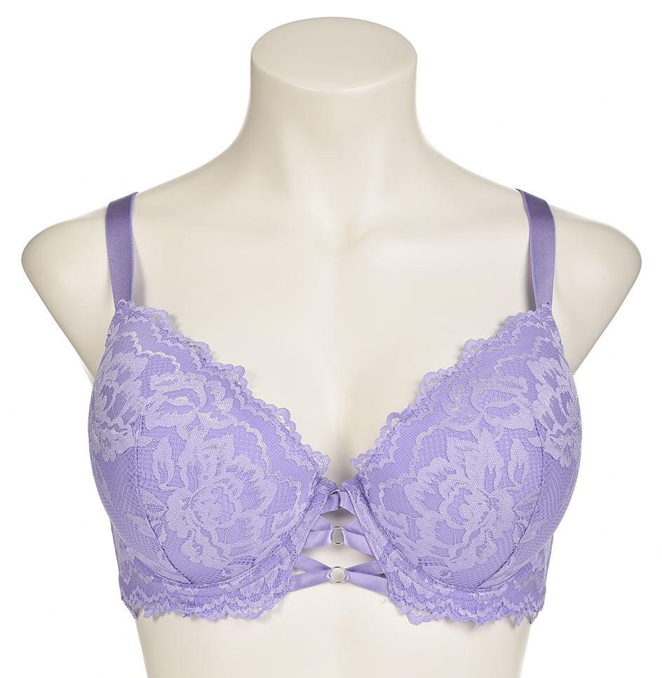 Елегантен лавандулов сутиен с дантела, оформящи подплънки и банели за изящен силует. Регулируеми презрамки, декорация с кръстосани ленти отпред и назъбен кант. Удобен за всеки ден и специални мигове.!