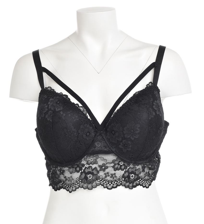 Елегантен черен сутиен с подплата и банели, дантелен longline дизайн, тънки регулируеми презрамки и V-образно деколте. Осигурява оформяне и комфорт за всекидневно и специално облекло. Перфектен избор.