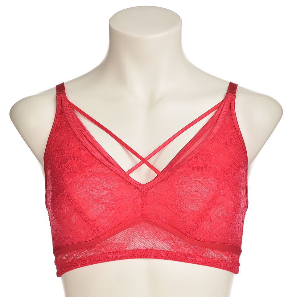 Червен дантелен сутиен-бралет с кръстосани фини презрамки, нежни неподплатени чашки без банели, широка дантелена подложка за подкрепа и регулируеми презрамки. Женствен и удобен за всеки ден.