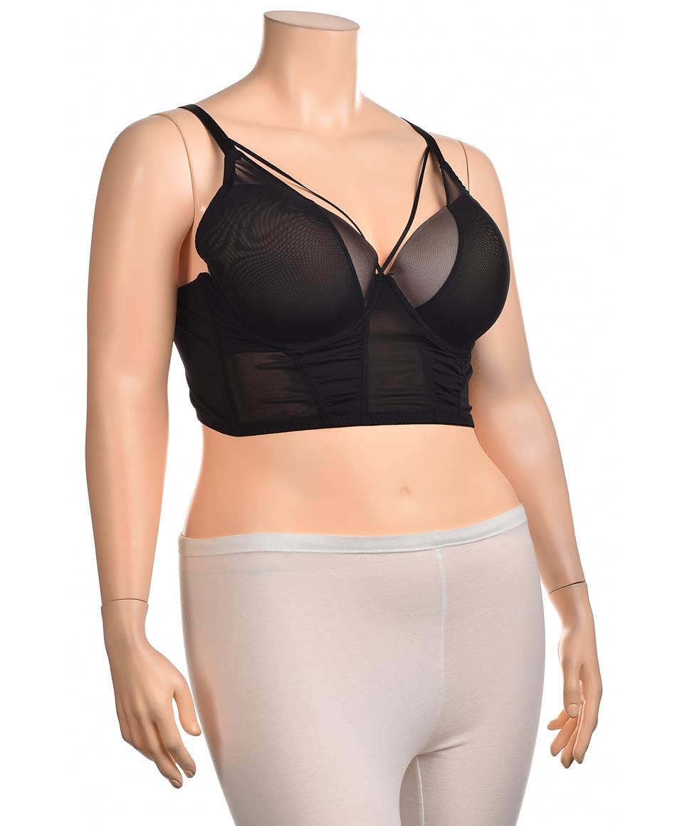 Черно бюстие с повдигащ ефект, меки оформящи чашки и полупрозрачни мрежести вложки. Дълъг корсетен модел за допълнителна подкрепа, регулиращи се презрамки и удобен подгъв за цялодневен комфорт. Стилно