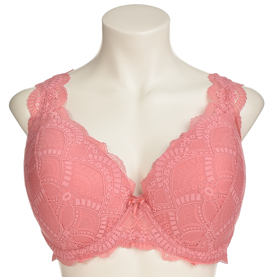 Елегантен розов дантелен сутиен с оформени чашки и банели, меко подплатен за комфорт и добра поддръжка. Широки дантелени презрамки и фина панделка отпред за женствен завършек. Подходящ за всеки ден!!