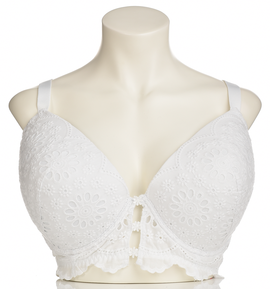 Елегантен бял сутиен с оформени чашки и мека подплата, дантелена флорална бродерия и декоративни перфорирани мотиви. Предно закопчаване, регулируеми презрамки и подплатено дъно за удобство. Перфектен!