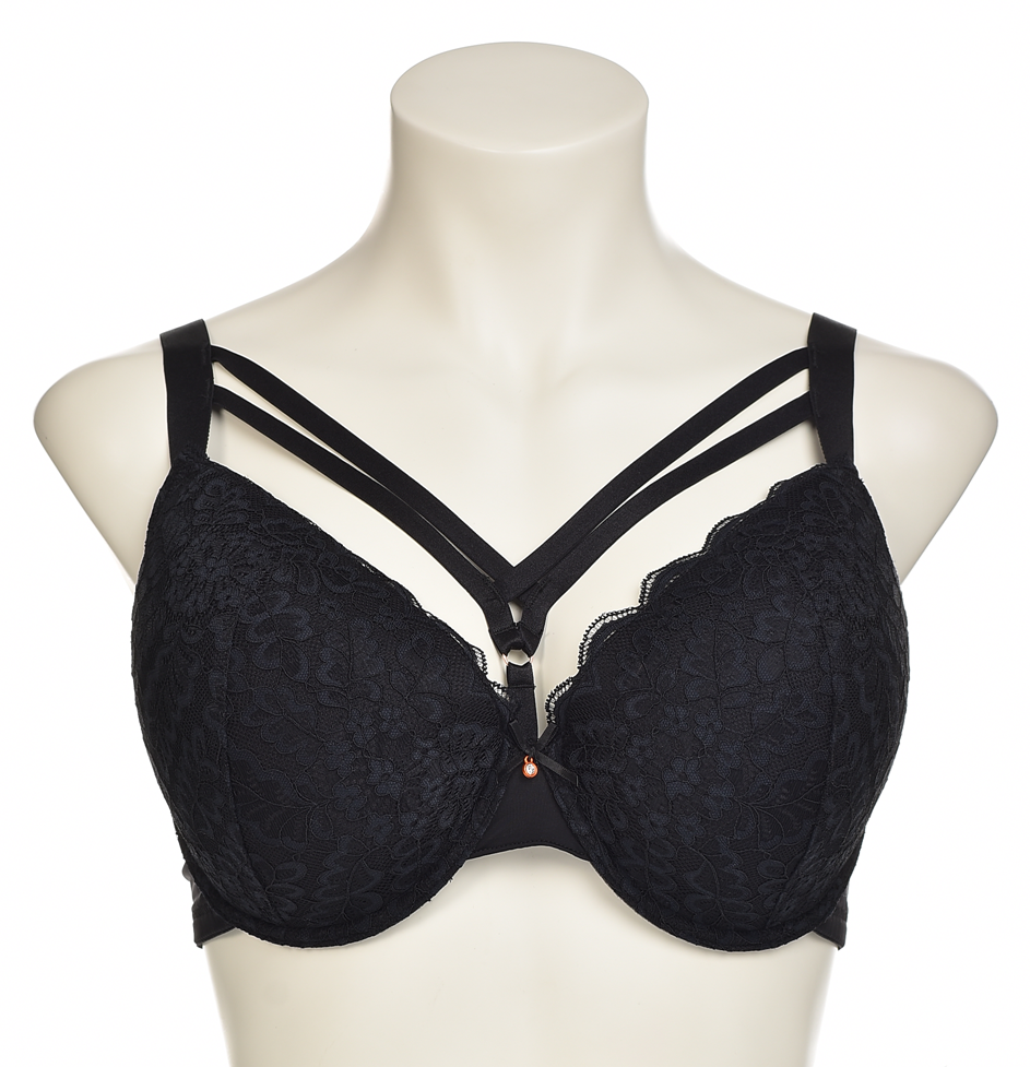 Елегантен черен дантелен сутиен с подплънки и банели, оформящ красива линия. Декоративни презрамки и допълнителни ленти над бюста. Регулируеми презрамки, удобен и стилен избор за всеки ден. Перфектен.