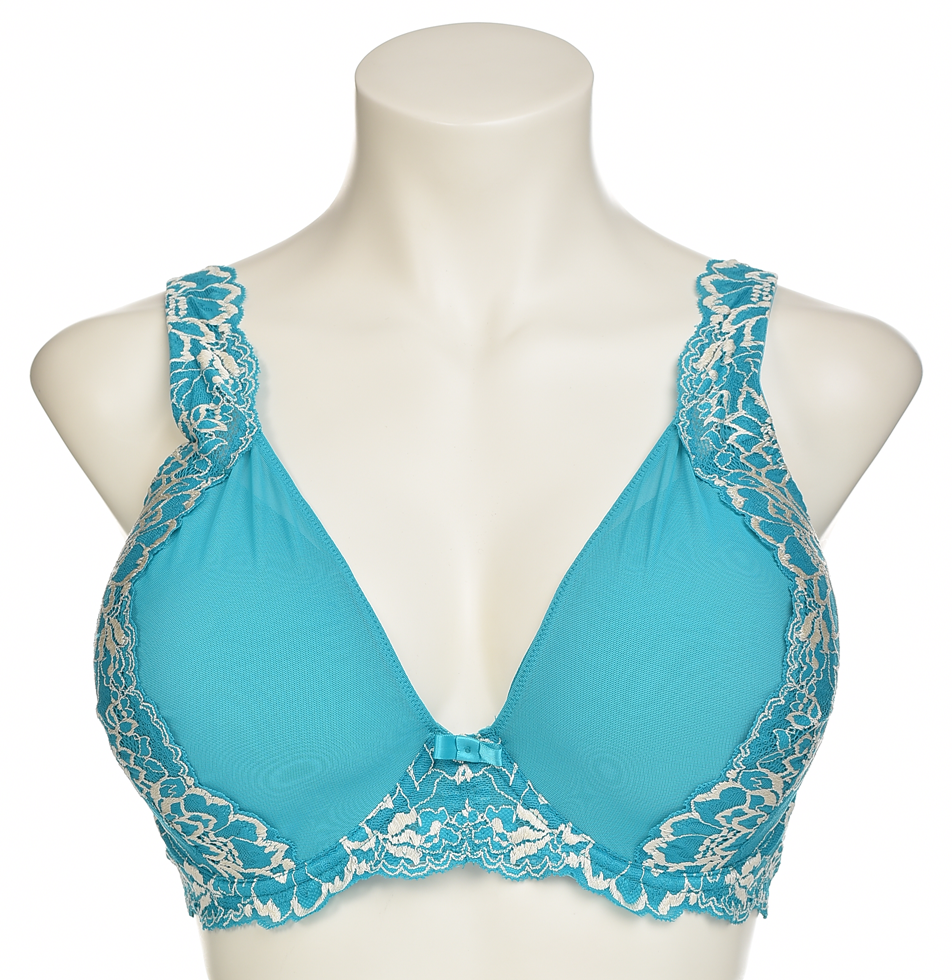 Тюркоазен дантелен сутиен с оформени подплатени чашки и хитри подплънки за отлична поддръжка и оформяне. Регулируеми широки презрамки, подгъв с флорална бродерия и малка декоративна панделка. Идеален!